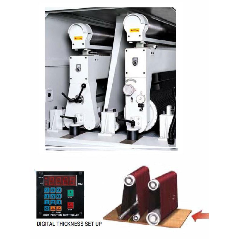 Le réglage informatisé de l’épaisseur est assuré par un affichage numérique précis. Il suffit de saisir la taille souhaitée et le mouvement automatique de la table permet une épaisseur de ponçage de 0,005″ (12,7 mm).